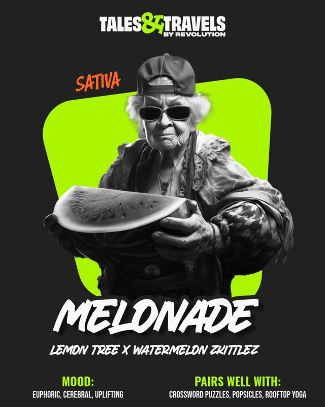 "Life just got sweeter! This juicy sativa crosses Lemon Tree and Watermelon Zkittlez for a strain that’s like summer in a jar. Experience uplifting effects while your mind floats away on a pool raft and a splash of Melonade is served up.